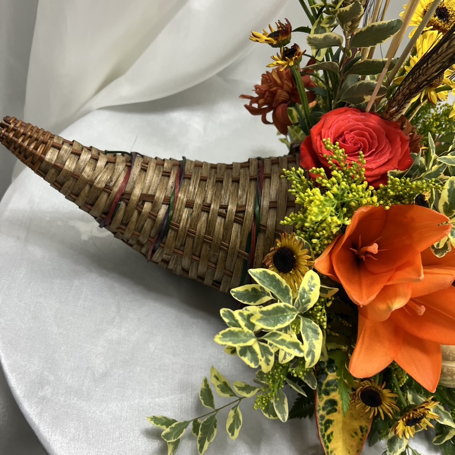 Celebrate fall with our Cornucopia arrangement, featuring vibrant seasonal blooms and autumn harvest elements. Perfect for Thanksgiving or adding a festive touch to your home.
