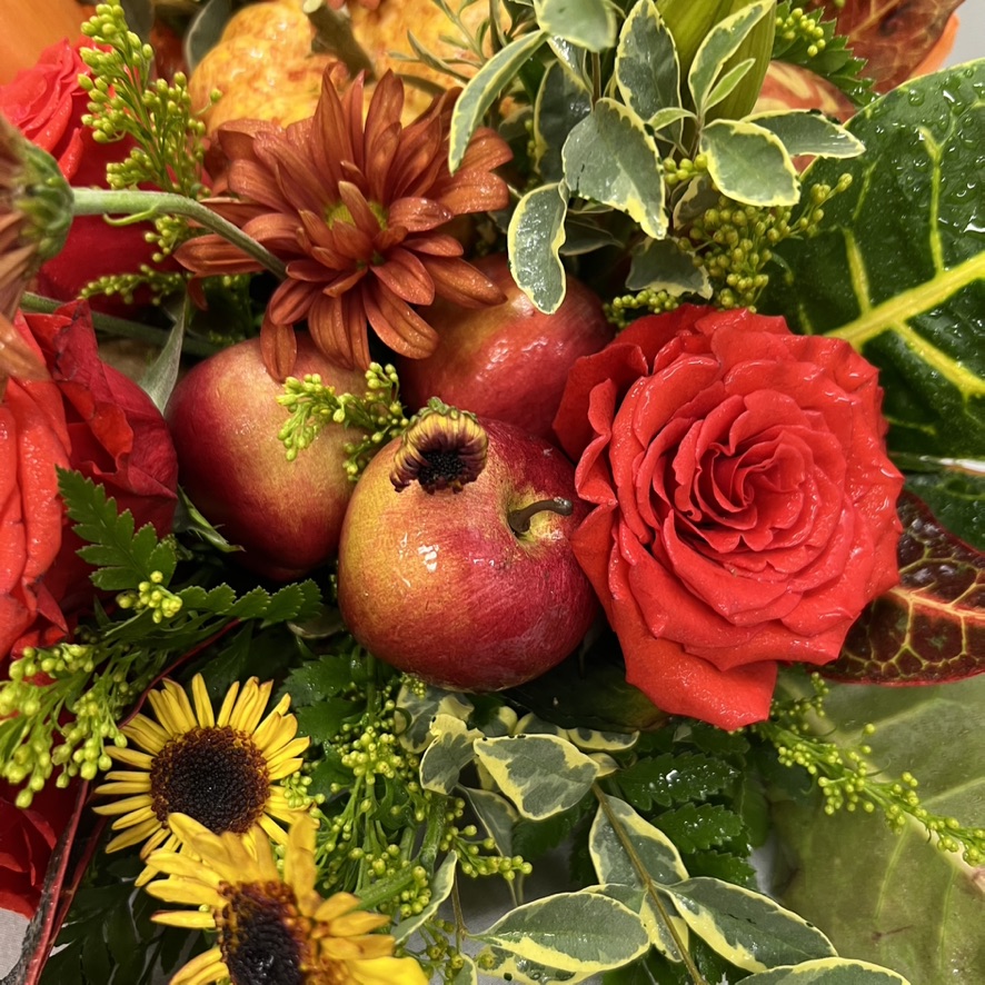 Celebrate fall with our Cornucopia arrangement, featuring vibrant seasonal blooms and autumn harvest elements. Perfect for Thanksgiving or adding a festive touch to your home.